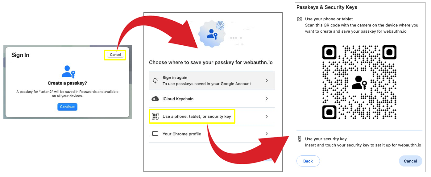 ■ Chrome on macOS (choose ‘Use a phone, tablet, or security key’, and when the dialog with a QR code appears, plug in and touch the security key):