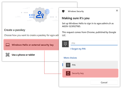 - When registering a passkey, carefully review the options in the Windows authentication dialog.
