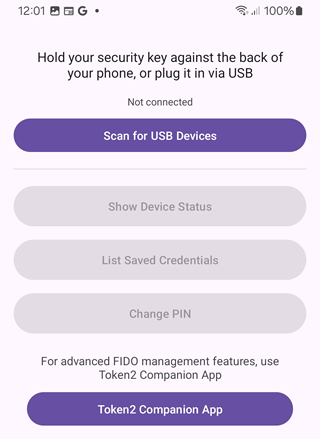 Inside FIDO Bridge, there may be a link to Token2’s Companion App — a management app for advanced key features such as TOTP profiles, passkey lists, and advanced FIDO2 configuration settings. The companion app provides a richer interface for key management and is optional. However, for basic FIDO2 management, AuthnKey/FIDO Bridge offers sufficient functionality for regular users.