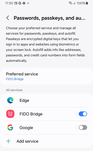 This tells Android to present FIDO Bridge as an option when a site or app requests passkey or security key login.