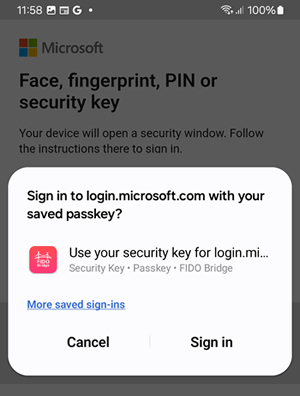 - NFC (tap your NFC key against your phone) - Using NFC with PIN-protected credentials is not natively supported; FIDO Bridge/AuthnKey is currently the only available solution.